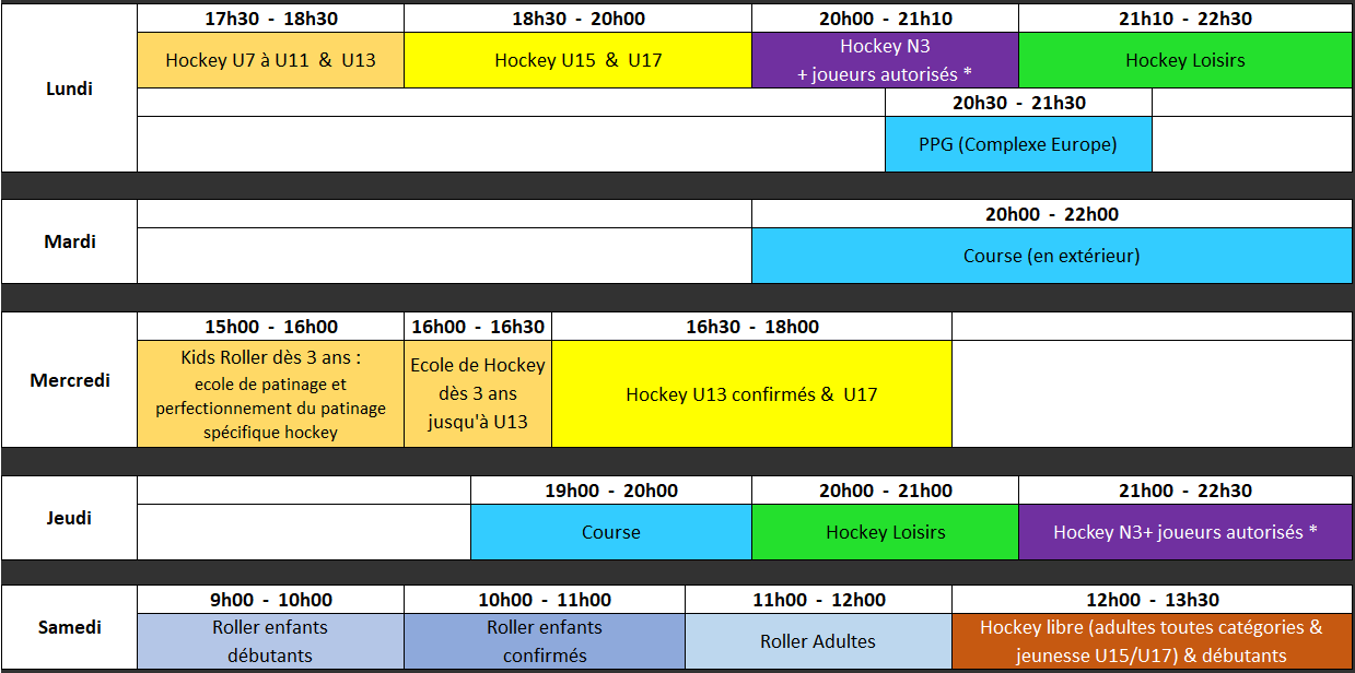 La catégorie Roller Enfants est réservée aux adhérents âgés de 5 a 14 ans, et Roller Adultes aux adhérents de 15 ans et plus. Le Kids Hockey est ouvert aux enfants dès 3 ans, peu importe leur niveau de patinage ou hockey. Les joueurs loisirs et U17 sélectionnés par les coachs sont autorisés à participer aux entrainements N3.